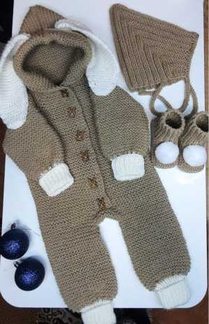 Комплект зайка ручной вязки с пинетками и шапочка. Очень красивый .