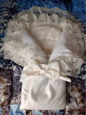 Шикарный конверт Самия молочный выполнен из тафты, сатина. Украшен качественным, красивым не съемным кружевом.