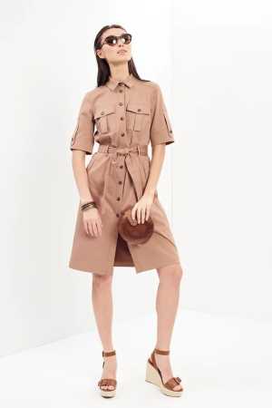 Бежевое платье с вышивкой и коротким рукавом. При росте 160 см доходит до колена. Платье плотное, бельё не просвечивает
